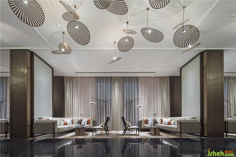 設(shè)計以一種「喧囂表像,內(nèi)隱閑情」的方式對話空間與人,只余經(jīng)美過濾后的本質(zhì)——典雅、舒適。景有浮翠星荷,扇里麥香,設(shè)計觀物取象,嵌入芭蕉扇與精美紋路的燈飾,形成精巧的時尚氣息,傳達(dá)出一種令人愿意親近且感到愉悅的氛圍。