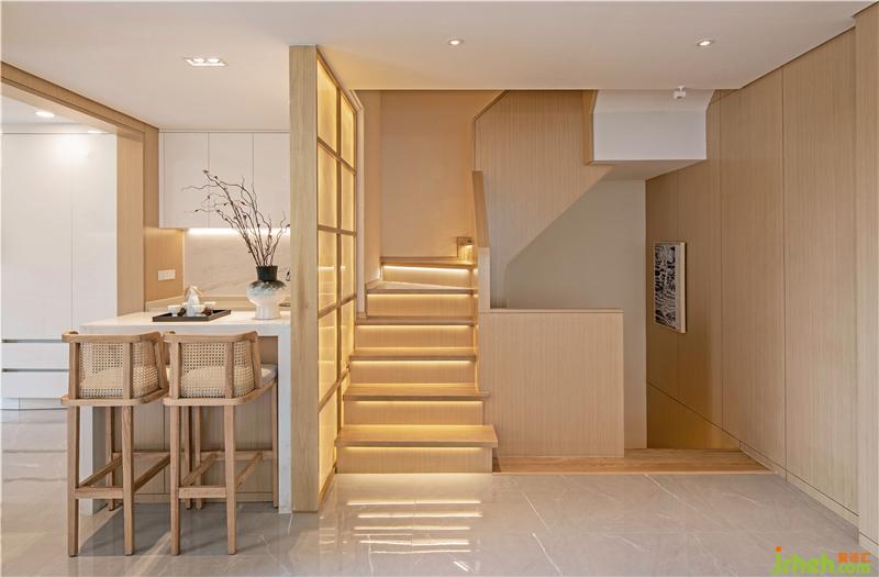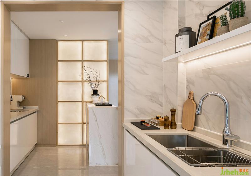 生活至上的樂(lè)趣,即便是只有兩個(gè)人的晚餐,用餐也要平凡不乏情調(diào)。樓梯旁的空間角落,室內(nèi)設(shè)計(jì)師將其改為中西廚結(jié)構(gòu),最大化劃分一層功能,當(dāng)暖光透過(guò)亞克力隔斷融化在空間時(shí),雖然濁茫如霧,此刻,卻也美好恬淡。