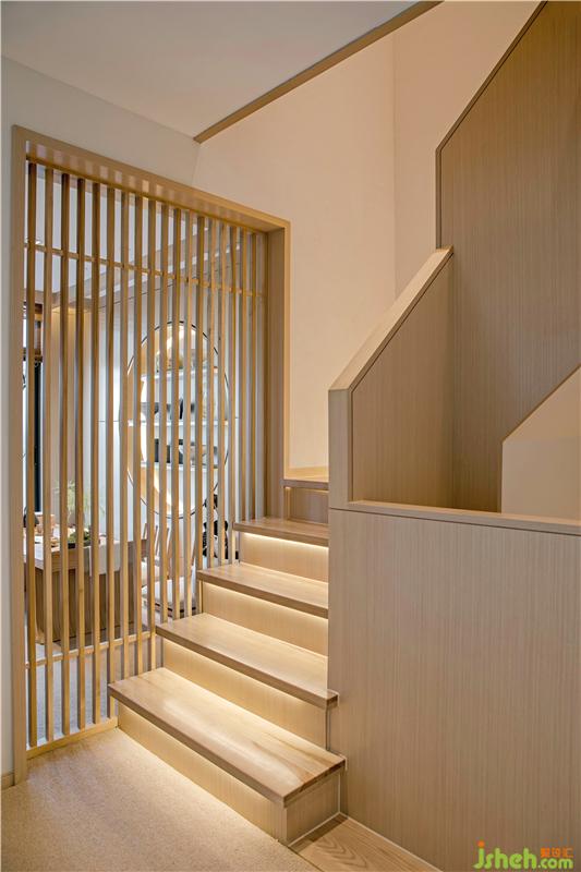 樓道干凈清雅,腳下的燈光散著妙不可言的姿態(tài),踏步,行至二樓,透過(guò)木格柵隔斷,隱約能看見(jiàn)里面的茶室,似透非透的結(jié)構(gòu)更能讓人心生想象,叫人挪不開(kāi)眼。