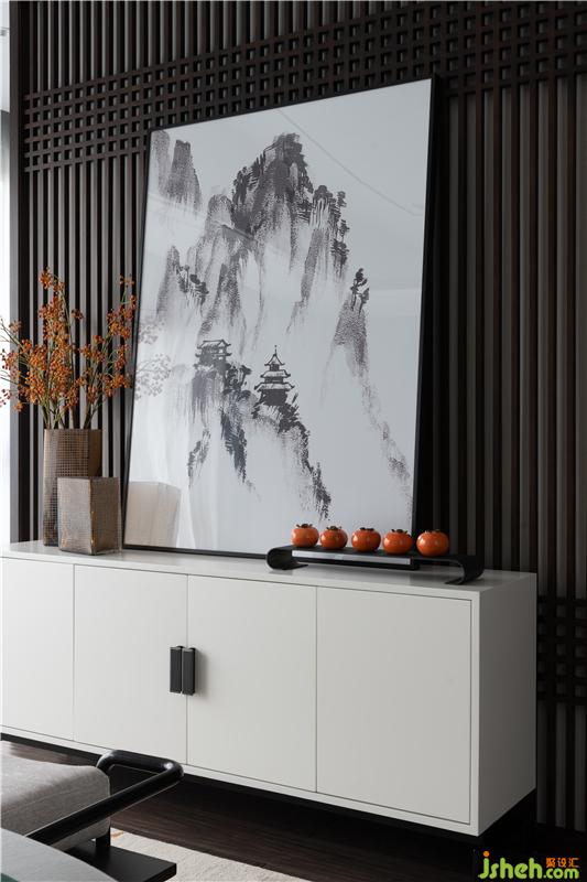 硬裝布局以非常精確的比例關(guān)系來描繪生活態(tài)度至上,開放式餐廳與茶席,也瞬間拉近了心理上的距離,傳統(tǒng)的中式餐桌椅,搭配飽含東方韻味的圓形水墨畫,以及棉麻的桌墊與盆景茶具,人文墨客推杯換盞的隱居生活畫面,悠然而愜意!