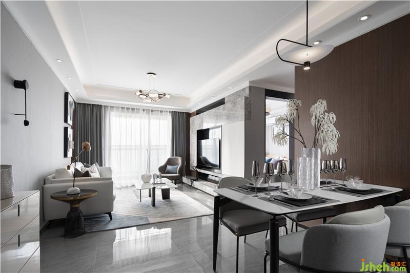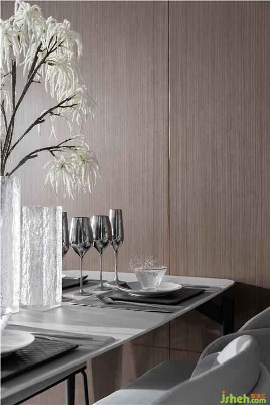客廳與餐廳相連,餐廳內(nèi)沒有過度強(qiáng)調(diào)色彩的華麗,是洗盡鉛華的故事畫面?;ú萆L,滿室清香,銀制餐具構(gòu)出空間整體品味,簡約實用的功能體驗和精雕細(xì)琢的工藝設(shè)計被濃縮在取景框里,洋溢著專屬于家人相處之間的浪漫與愜意畫卷。