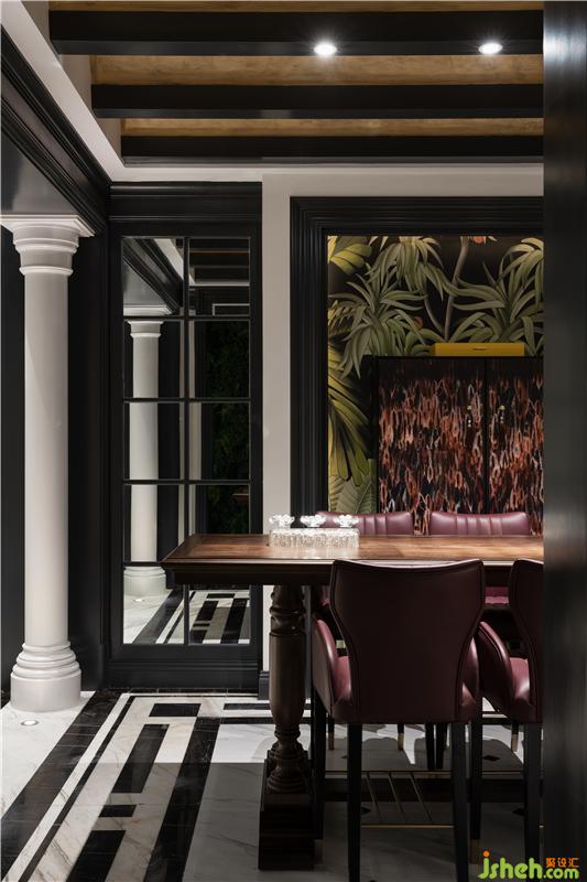 進(jìn)入party區(qū),超挑高法式拱門勾勒大廳的敞闊感,空間恰到好處的線條點(diǎn)綴,產(chǎn)生新與舊的對(duì)話。休閑區(qū)實(shí)用性必不可少,party區(qū)一側(cè)細(xì)致地安排了酒吧區(qū)及酒窖,大面積的黑色搭配,為空間投下一道重彩。