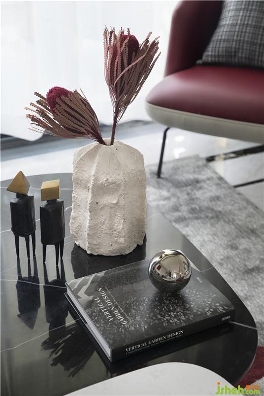柔灰沙發(fā)營造空間溫潤流動效果,茶幾上的藝術(shù)美物更是一幅沉靜張力的端景,伴隨著每一細節(jié)的遞入,空間的記憶點更有別致有趣的觀照。