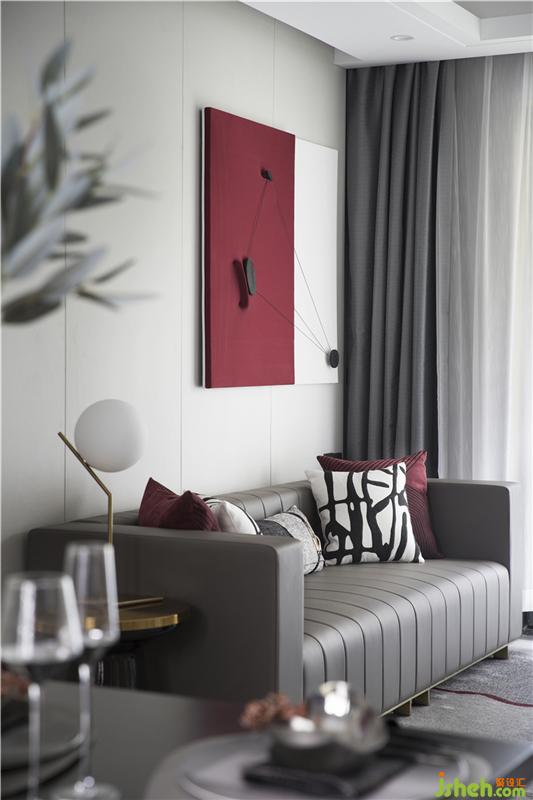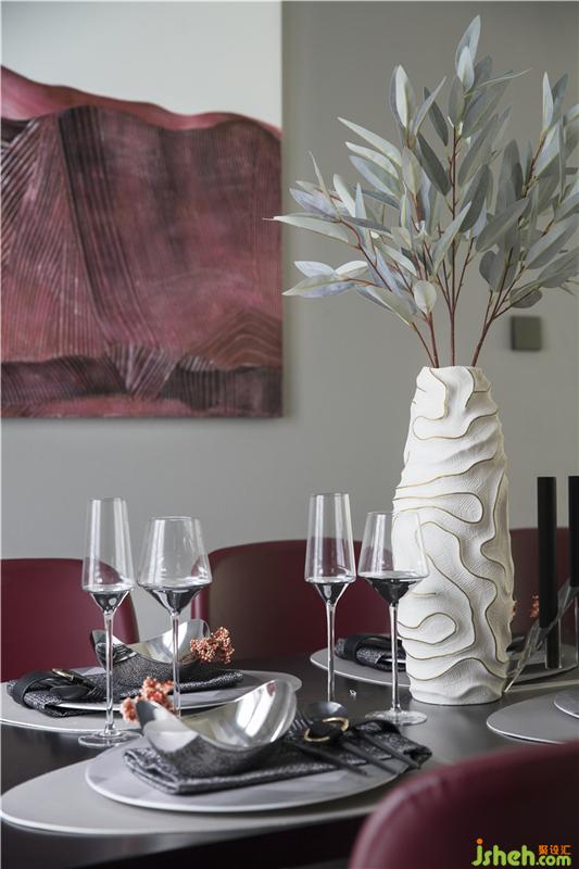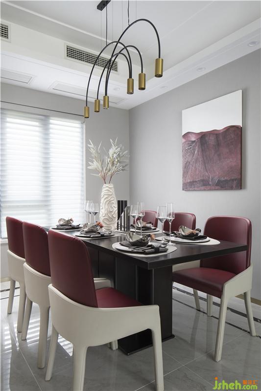 開放式布局為餐廳傾注一抹濃郁,酒紅色調(diào)提升凈白基底的視覺張力,達到客餐廳尺度的串連延伸。