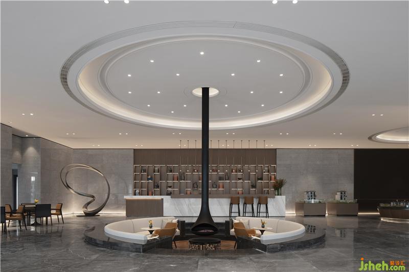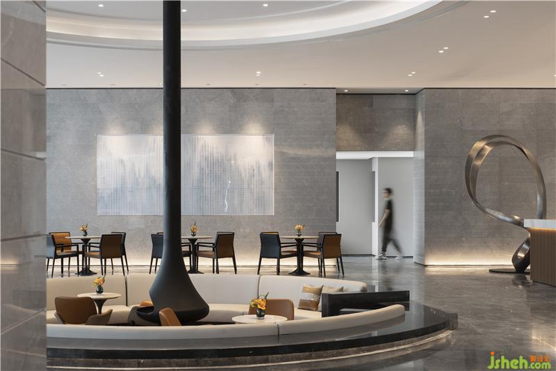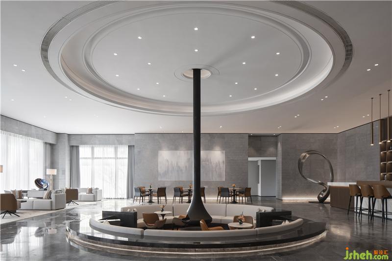 步入下沉式洽談區(qū),空間交錯起伏隨光影變幻,