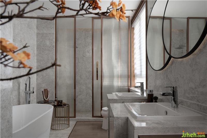 愛馬仕灰石材與白色人造石,還有山水紋石材搭配