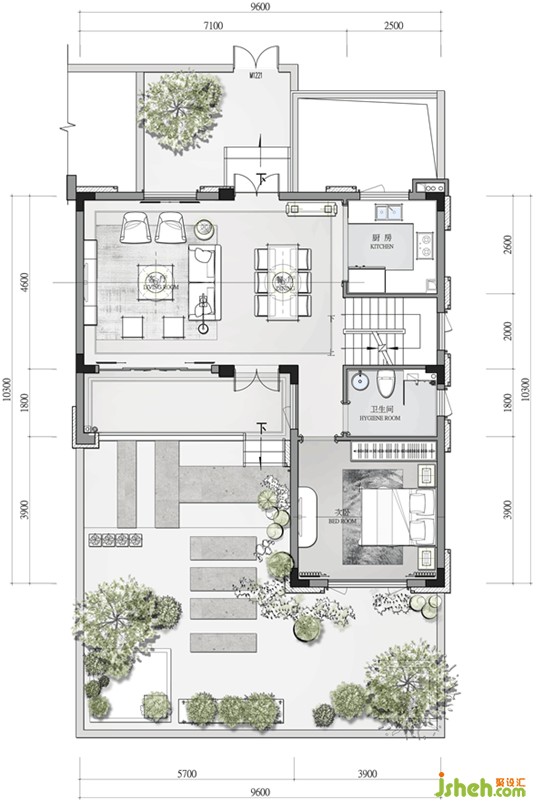 炎炎夏日,室外綠樹如蓋,知了喧天,室內(nèi)溫情敝屣。下沉式庭院并無其他物體填充,做減法的設計在滿足功能的同時兼具視線所及的美感,單一套座椅,便能滿足居住者休閑的需求。