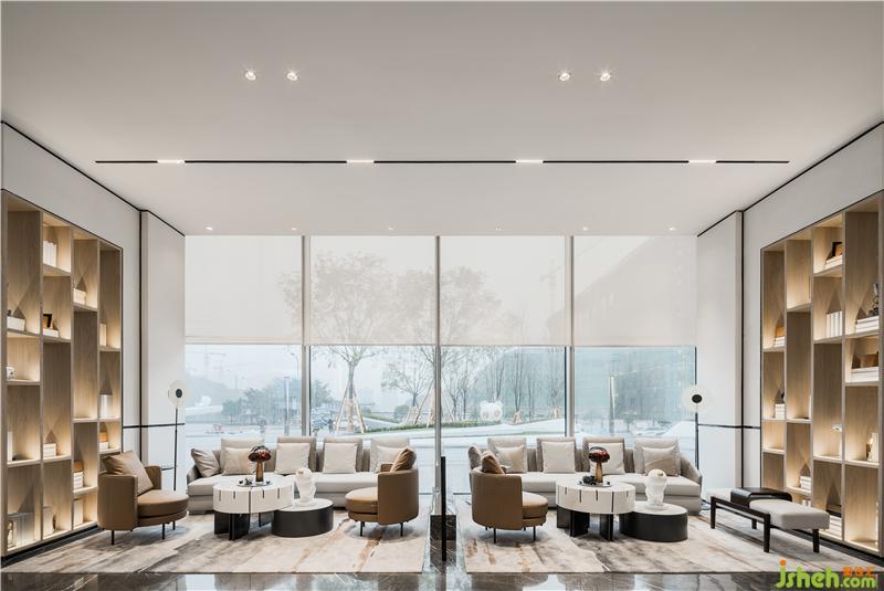 整個建筑為方形建筑,側(cè)為整面的玻璃幕墻,結(jié)合建筑。建筑的特性使得重慶售樓處室內(nèi)區(qū)域光線成為鋪滿整個空間點。所以我們設(shè)想在區(qū)域內(nèi)讓陽光作為空間線索,使得整個建筑從外看就仿佛是一幅震撼的畫卷。并且通過它來串聯(lián)整個空間。
