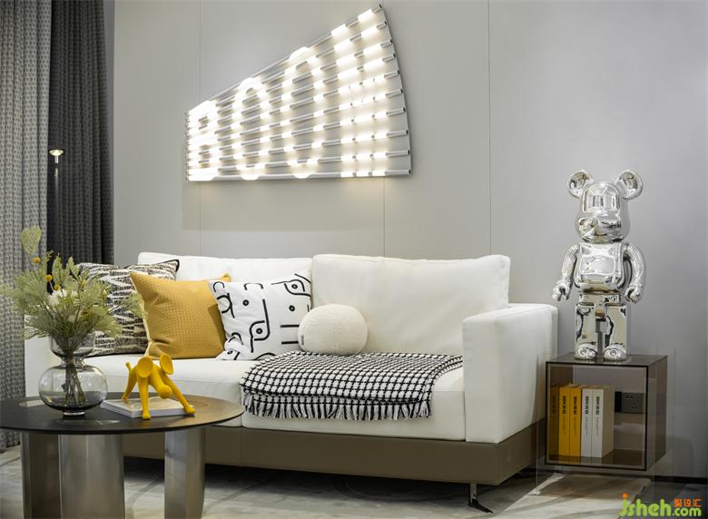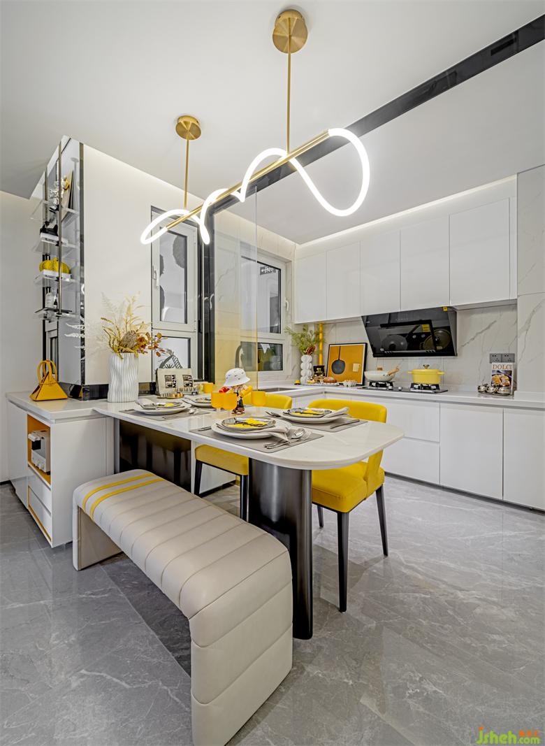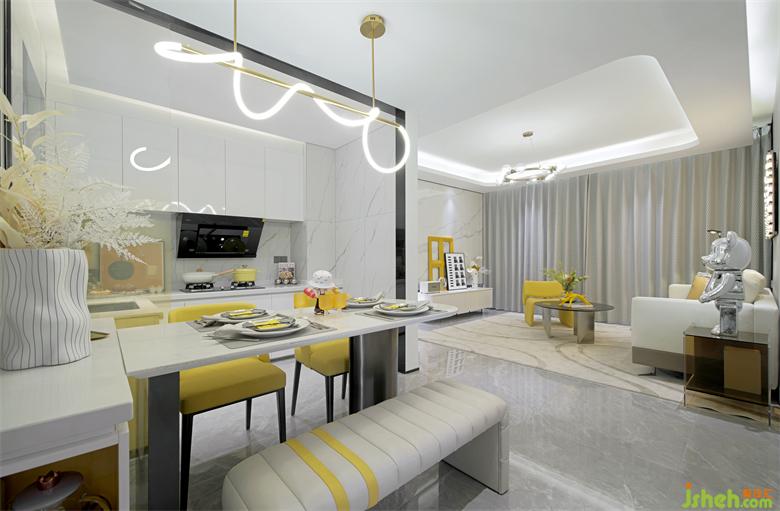 LDK的平面布局,讓視覺更加通透,同時也能更好地滿足不同場景下生活需求。樣板房設(shè)計落地窗為客廳帶來充足的光線,經(jīng)過一層薄紗柔和地灑在房間的每個角落。兩面墻壁都運(yùn)用了干凈的石材結(jié)合明黃色的裝置點(diǎn)綴,讓空間層次和視覺效果都更為豐富。我們將鞋柜與餐廳吧臺連同提升空間整體感。廚房改為開放式廚房,提升空間整體通透性,及流動空間趣味性。