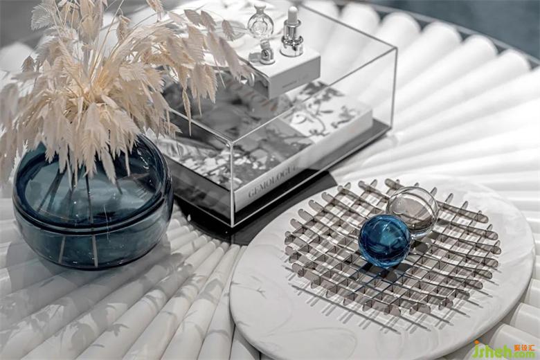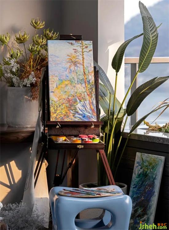 然后將源于自然的綠意在空間內(nèi)蔓延開來,不同材質(zhì)的裝飾面,以及精致的裝置藝術(shù)畫,將森林的生態(tài)性現(xiàn)在眼前。女主的人設(shè)是一朵霸王花,意思是那種堅(jiān)強(qiáng),有活力的女生、而鼠尾草的花語為善良可愛、藍(lán)色燈籠果通常它代表一種很高貴的愛情、尤加利葉,是澳大利亞的國樹、代表高貴,恩賜......陳設(shè)的布置,與書房原創(chuàng)的定制畫作相互呼應(yīng)。樣板房設(shè)計(jì)場(chǎng)域本身即是場(chǎng)花藝與畫技,畫技與創(chuàng)作的實(shí)驗(yàn)。我們可以打開宏觀的視野,觀看設(shè)計(jì)師用簡而有力的巧思,在乾淨(jìng)的結(jié)構(gòu)下精準(zhǔn)勾勒生活的形體輪廓。又或者站得靠近些,以微距的焦段,探知藏於細(xì)部的精心巧作 —— 那些浮現(xiàn)表象、顯而易見的無懈可擊,正是構(gòu)建自所有不可見的微小系統(tǒng)。