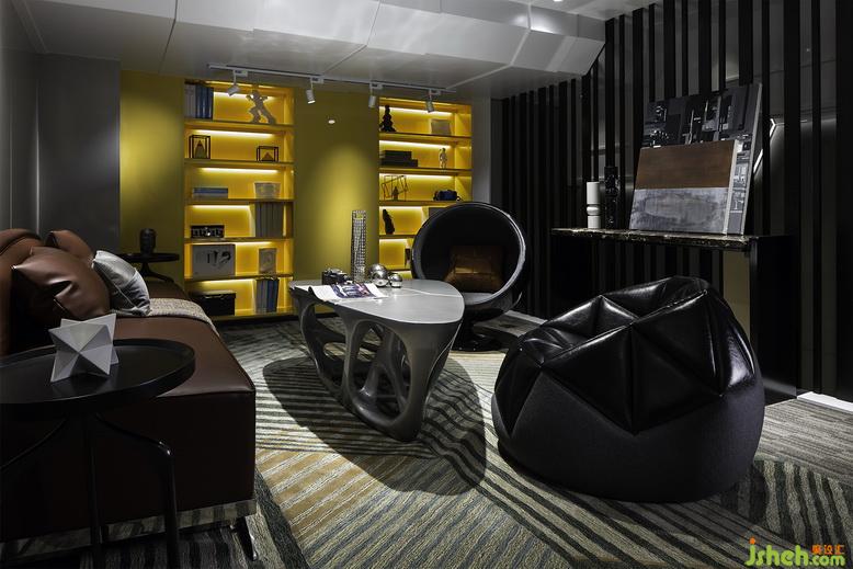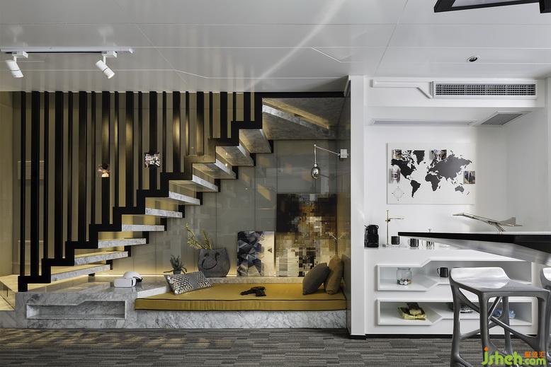 層次豐富的線條和看似低調(diào)卻細節(jié)滿滿的輕奢空間結(jié)合,完整地勾勒出辦公室不平凡的獨特。簡潔鏤空的樓梯設(shè)計,黑色的護欄更是為空間增色不少,在樓梯的下面,設(shè)計公司還為此而設(shè)計了一個黃色的小床,除了形成色彩的呼應(yīng)之外,更是起到了物盡其用的效果,讓大家在休閑之余,有一個如家般的溫馨感受。