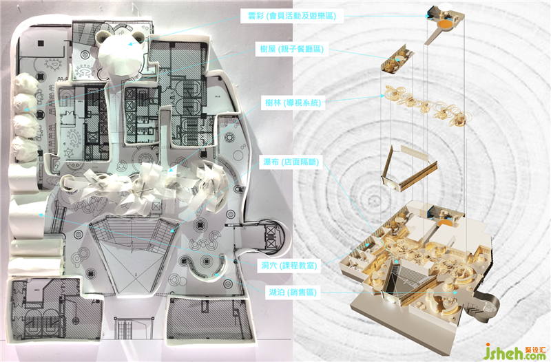 整個兒童書店設計空間圍繞住中間的亮點是浮在天空上面巨型的發(fā)亮花瓣造型,在不同的區(qū)域都能夠識別它們的方向感,從而達到標志系統(tǒng)的功能。