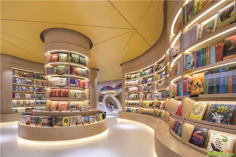 零售區(qū)域是一個售賣兒童繪本,圖書和文具等不同類別產(chǎn)品的一個人性化空間,溫暖的色調(diào)由天花的黃色和全高木皮的墻體和書柜所創(chuàng)造。在不同的曲線組合上面我們創(chuàng)造了有開放式和私密式等不同的閱讀區(qū)域,加上自然光線所賦予的一些閱讀窗口,給父母和兒童一起在這個零售空間中沉淀心靈和專心閱讀。