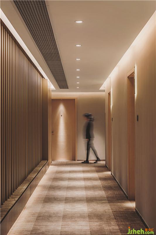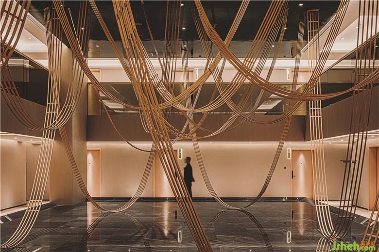 每?jī)蓪涌头慷家肓穗p高中央庭院。一個(gè)反射性的湖面,竹制的舞蹈曲線自然落下,仿佛在空中漂浮著云朵。這種天花板懸掛結(jié)構(gòu)再次與竹編織大師協(xié)商如何利用其自然彈性和傳統(tǒng)連接方法創(chuàng)建曲線。到達(dá)房間前,客人會(huì)感覺像穿過一片抽象的竹林。