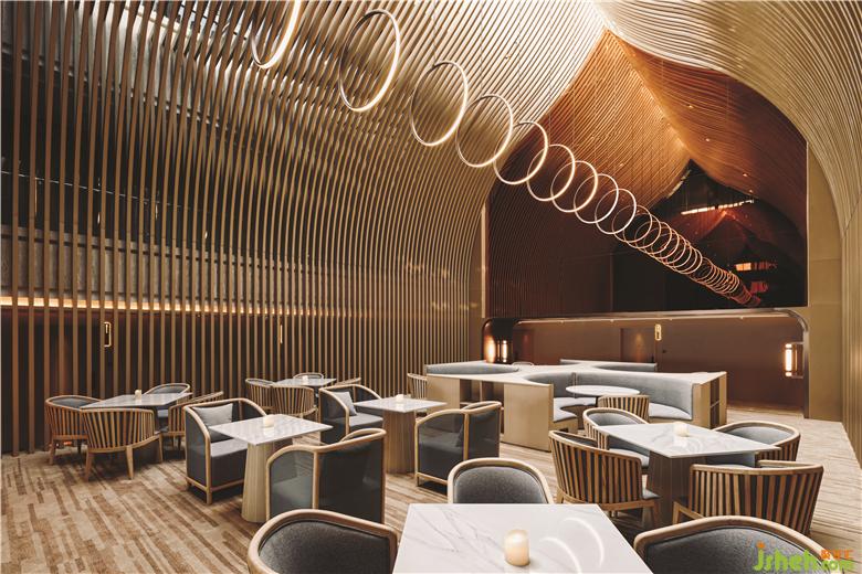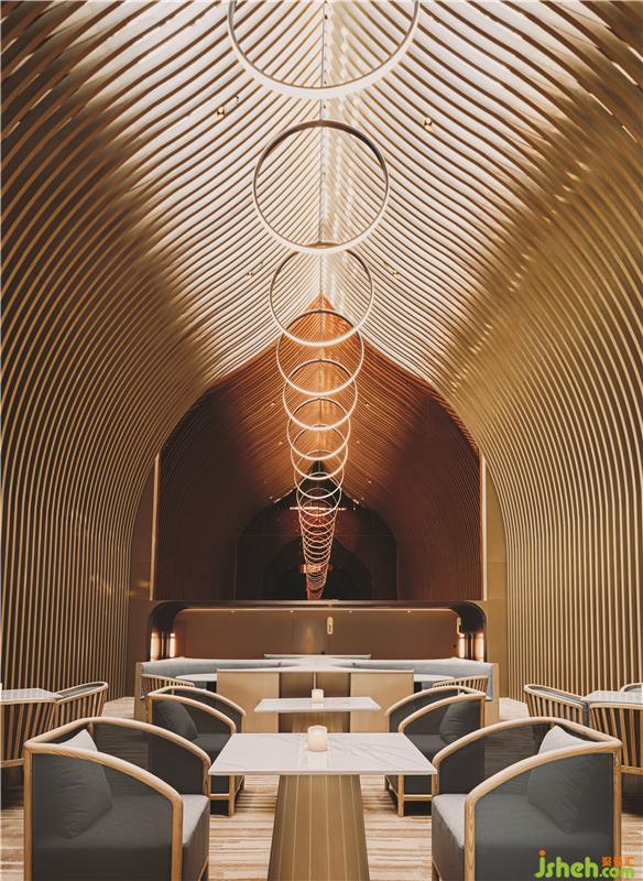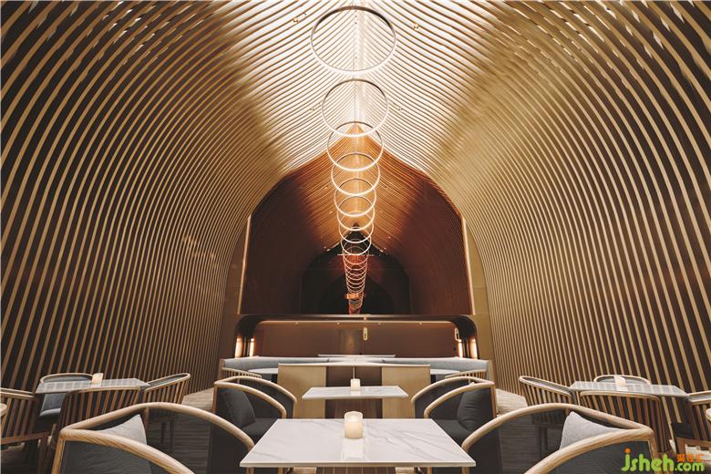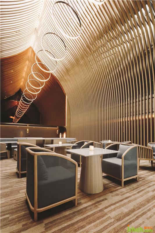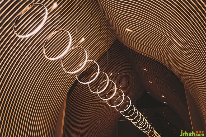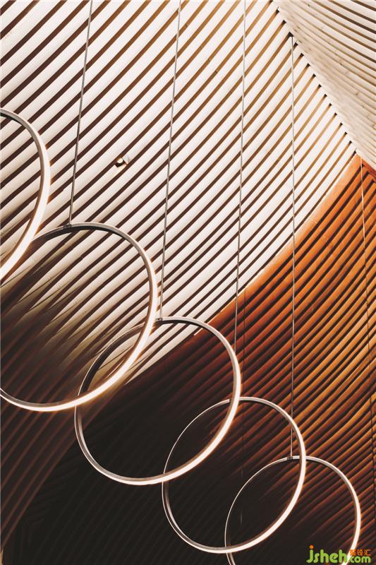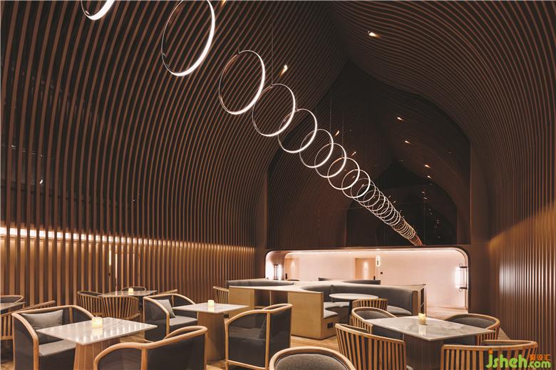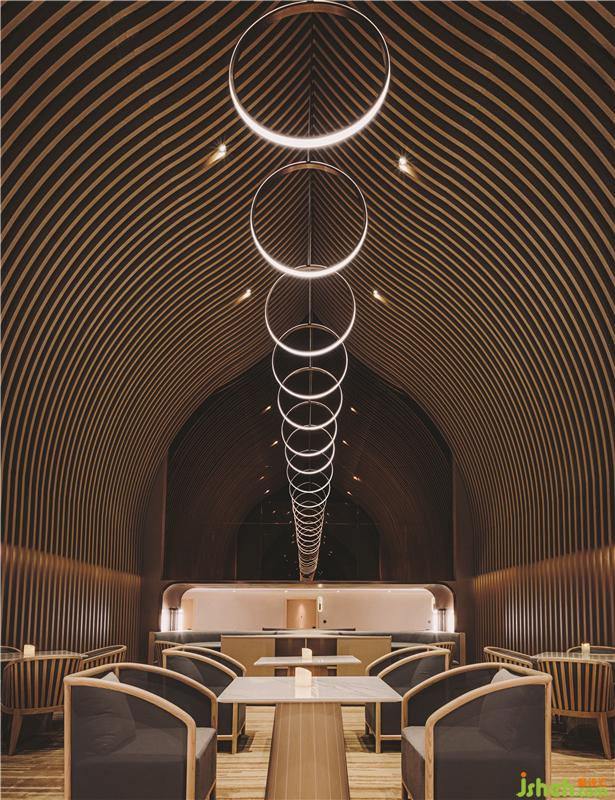 在頂樓的SkyCafé,全高的竹子結(jié)構(gòu)構(gòu)成了禪宗和教堂般的空間。上方的天窗可以讓白天的自然光落在座位區(qū)的中間。商務(wù)酒店設(shè)計(jì)吊頂懸掛的圓形LED燈形成無盡的發(fā)光月亮,并在夜間為客人提供詩意的體驗(yàn)。