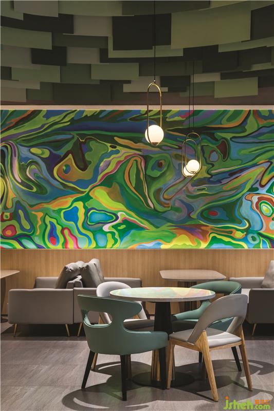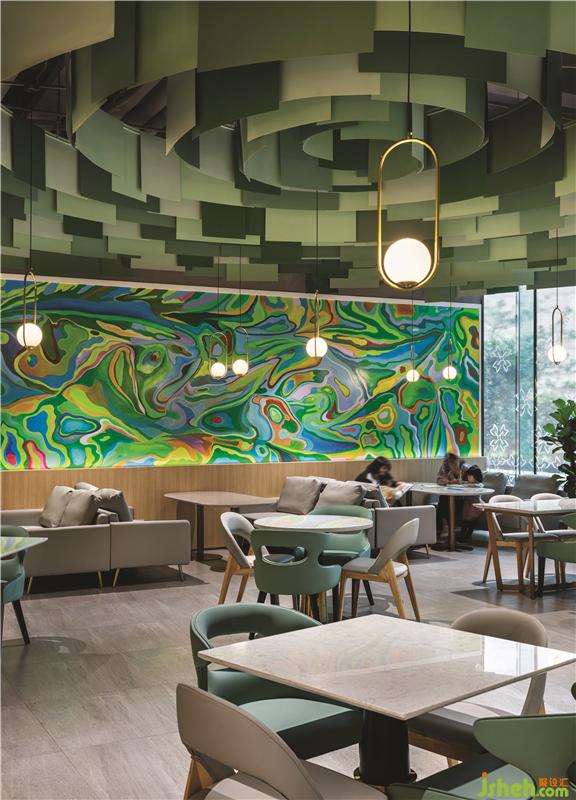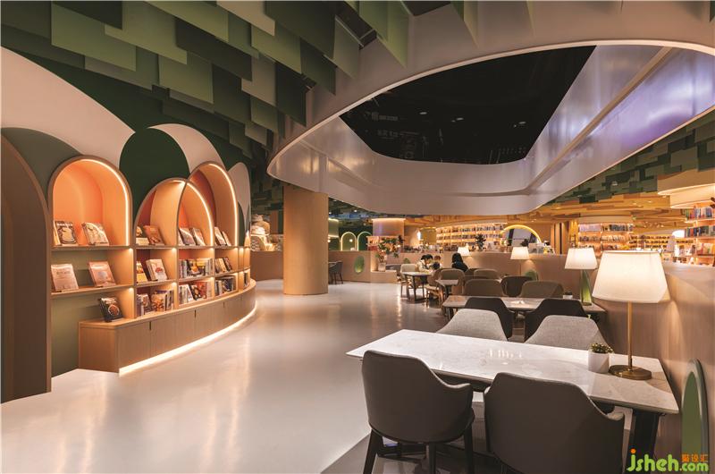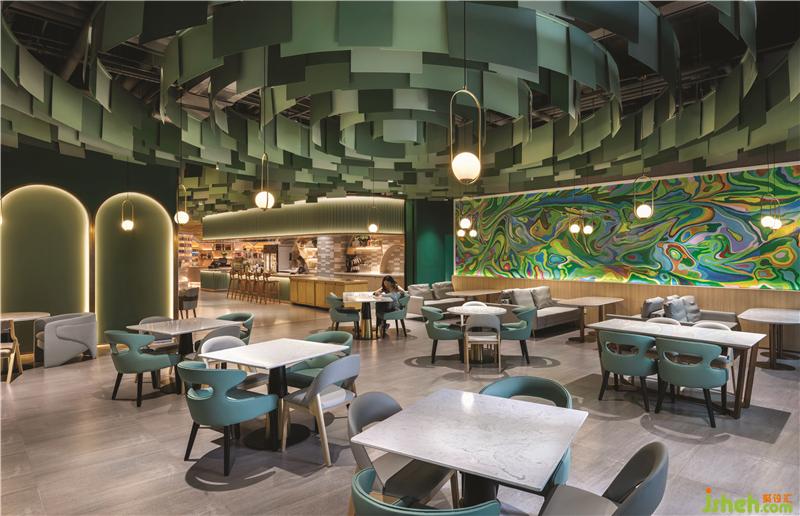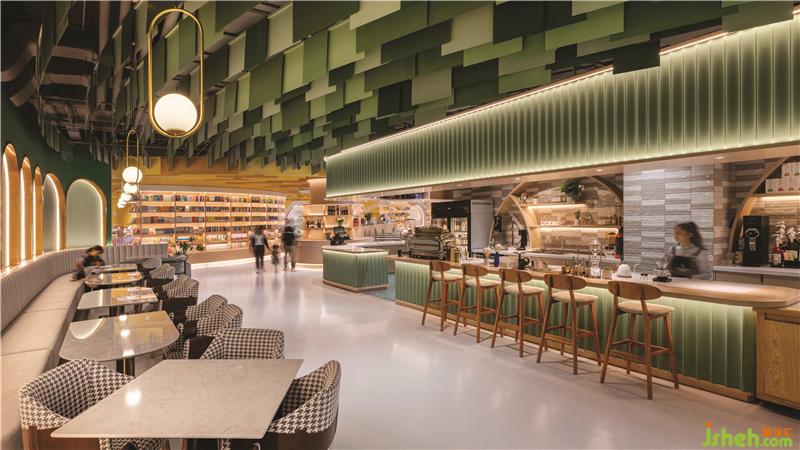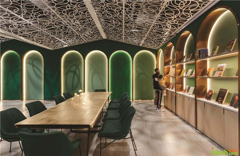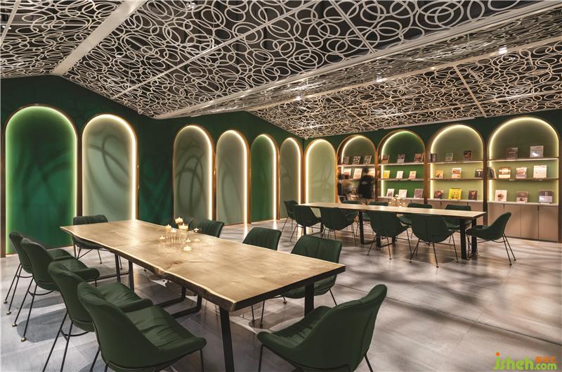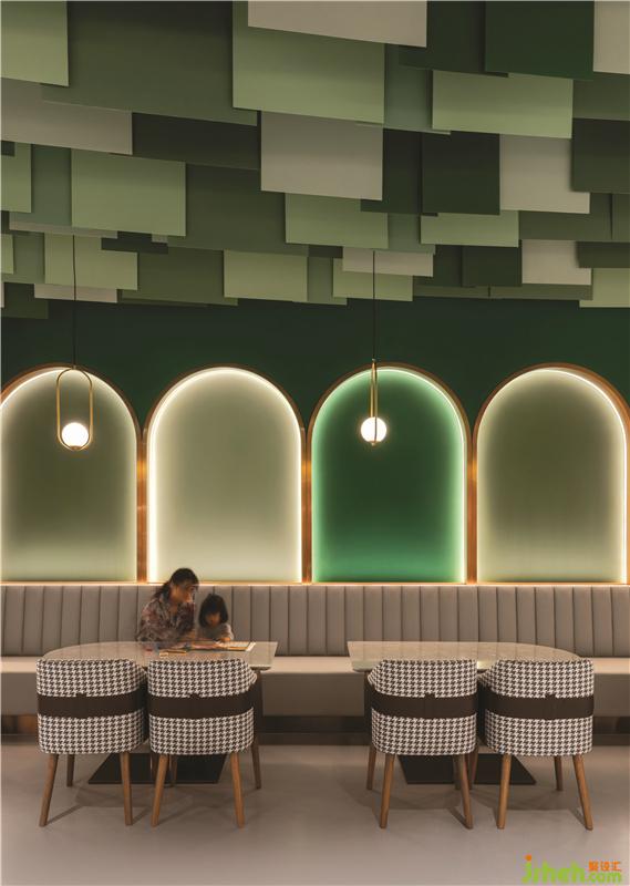 第三個(gè)區(qū)域是綠色調(diào)子的親子餐廳,由三個(gè)不同的功能區(qū)域組成:兒童書(shū)店設(shè)計(jì)橢圓劇場(chǎng)周圍的平臺(tái)用餐區(qū),開(kāi)放式廚房對(duì)面的長(zhǎng)椅就座區(qū)以及激光切割白色金屬板制成描繪花園洋房的形狀的VIP區(qū)。