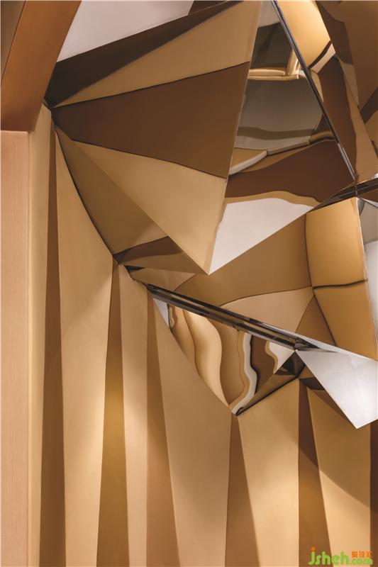 多角度鏡面不銹鋼天花營(yíng)造出視覺上的錯(cuò)覺和空間剌激,并描繪了“天空是極限”的信息。