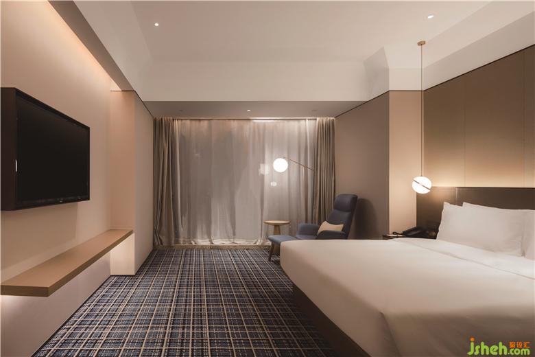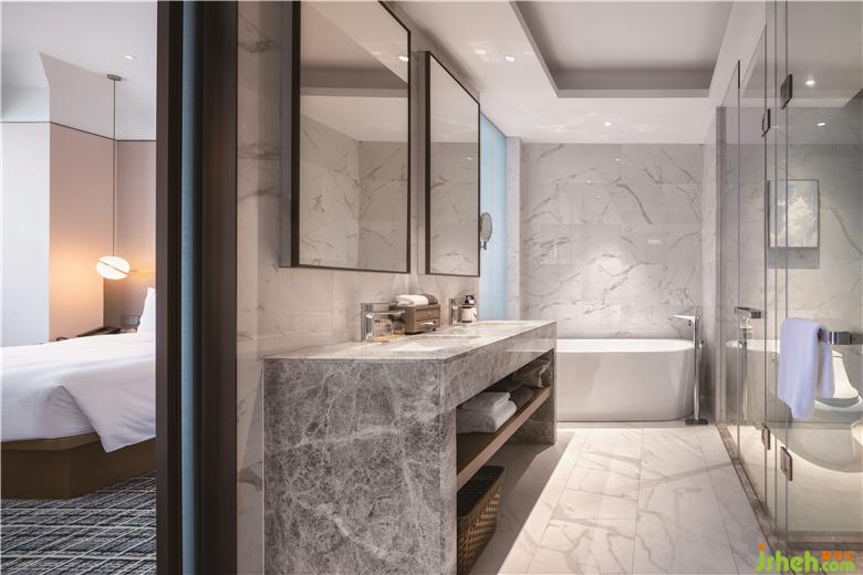 淺灰色的牆壁和天藍(lán)色的圖案地毯陪伴著標(biāo)準(zhǔn)樓層走廊和客房中的所有客人。簡(jiǎn)潔的造型,床頭板上的暗藏?zé)舨酆桶咨罄硎陌腴_(kāi)放式洗手間延續(xù)了整體的簡(jiǎn)約美學(xué),旨在為客人提供寧?kù)o祥和的氛圍。