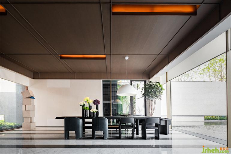 建筑的成立,根本在于空間的意義,而通過形式的操作來實(shí)現(xiàn)整體概念的具象化。南京會(huì)所設(shè)計(jì)內(nèi)部空間與建筑外觀站在“空”與 “有”的?度于設(shè)計(jì)初期便展開密切研討。廣泛的通透玻璃面設(shè)置將充滿藝術(shù)氛圍的內(nèi)部世界牽引至表皮,內(nèi)部空間邏輯強(qiáng)化了建筑表達(dá),外部景觀世界欣喜地發(fā)現(xiàn)自身得到了呼應(yīng),建筑藝術(shù)不再局限于空間的圍合,動(dòng)態(tài)的觀念取代了靜態(tài)的觀念。