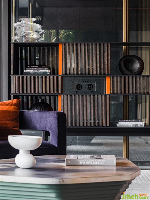 主要材料:德賽斯巖板、葡萄牙米?大理石、木飾面、夾絲玻璃