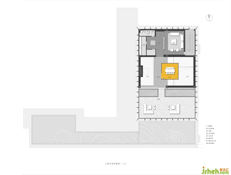 與?斯洛的需求層次模型相契合,在下部兩層滿足了歸屬、尊重等需求后,南京會所設(shè)計頂層承擔(dān)了建筑最終的自我實現(xiàn)。藝術(shù)展廳中心上空,橙色的休憩室以極其注目的方式出挑。作為建筑群體意識的頂點,這顆跳動的“心臟”與屋面景觀攜手造就空間中樞,向四周輻射能量。氣息上, 出于對空間?色的轉(zhuǎn)變的適應(yīng),本次南京會所設(shè)計嘗試通過細(xì)部構(gòu)造、軟裝飾品的精細(xì)調(diào)整,塑造由 底部裝飾感向頂部雕塑感的轉(zhuǎn)變。
