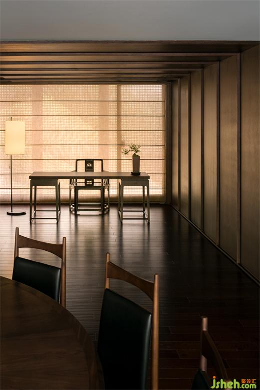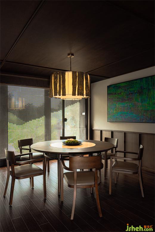 一簾半遮半掩的后院山色襲人,透過玻璃捕捉到山脈另一端的朝陽。觀景臺纖細(xì)柱體陣列延伸至遠(yuǎn)方與草木相接,廊檐借助頂棚金屬板的漫反射,放大戶外四時之景,融合室內(nèi)人物活動。南京會所設(shè)計者以拓寬維度的手法,使纖細(xì)得以彰顯出磅礴之勢。此時,觀景臺由于食客的欣喜而充滿暖意,恰如春光融和。