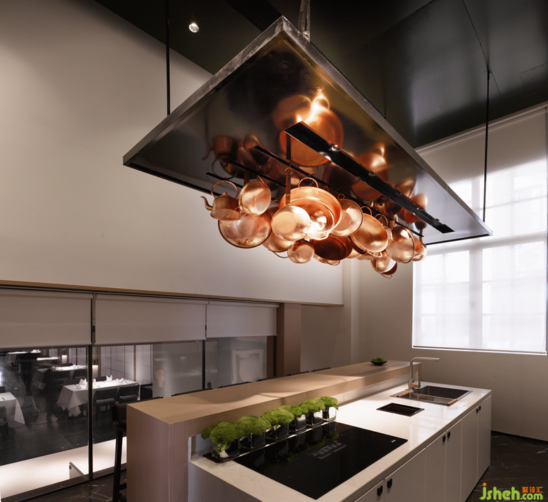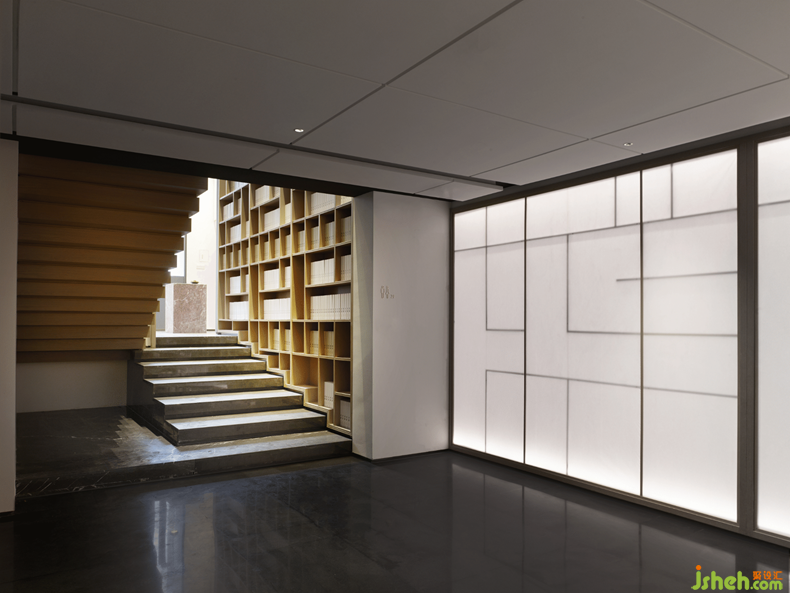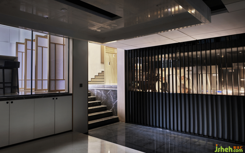 通往半地下一層空間被劃分成開敞式廚房與就餐區(qū),食客與制作者的關(guān)系應(yīng)是互為賞識的,前提是保有距離,一種互通并不斷保持變化的遠(yuǎn)近關(guān)系,黑色條形鋼板制作的區(qū)間分割面,被設(shè)計(jì)者稱之為“空間面紗”的序列,在食客行走的過程中,視線不斷被放大,從而發(fā)現(xiàn)食物被制作的過程當(dāng)是欣喜。“覺知”此刻表現(xiàn)為互賞者的心理交流。餐廳設(shè)計(jì)就餐區(qū)的臨窗立面,開窗雜亂之際光的肆意,用宣紙材質(zhì)裱糊出的屏風(fēng)墻,將自然光線進(jìn)行二次過濾,暈染出糯白的儒雅氣氛,黑與白的沖突美學(xué),一如“面紗”的正反面。
