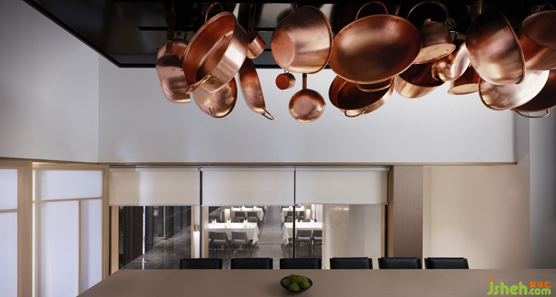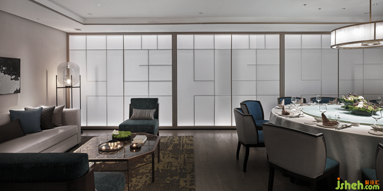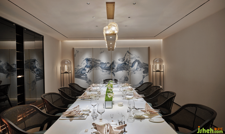 由通道立面設(shè)置的隱框門進(jìn)入,忽然開朗之余更多的是面對隱逸環(huán)境的興奮與自信,臨窗界面依舊采用宣紙屏風(fēng)將自然光線過濾并充斥空間,光線照射后的樹影在某個(gè)時(shí)段內(nèi)成為主角與佳肴一同演繹。