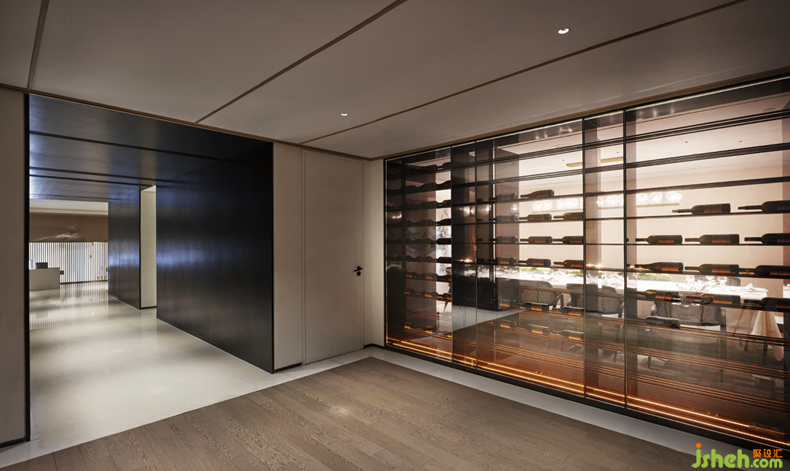 沿廳右側(cè)拾階而上,到達(dá)二層私密就餐區(qū),通道中置,兩側(cè)各為大小私密就餐單元,餐廳設(shè)計(jì)為促進(jìn)食客快速通過,避免公區(qū)停留,黑色木飾面材質(zhì)制作的輕薄界面由頂面包裹至立面,并將各單元相互串聯(lián),呈現(xiàn)出相對壓迫且神秘的氣氛,白色石材地面配合燈光序列,成為引導(dǎo)進(jìn)入的顯性指示。