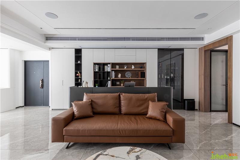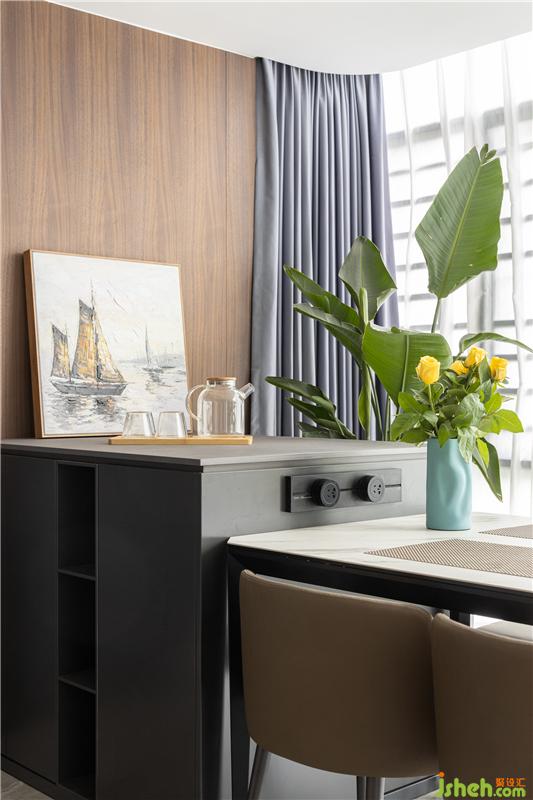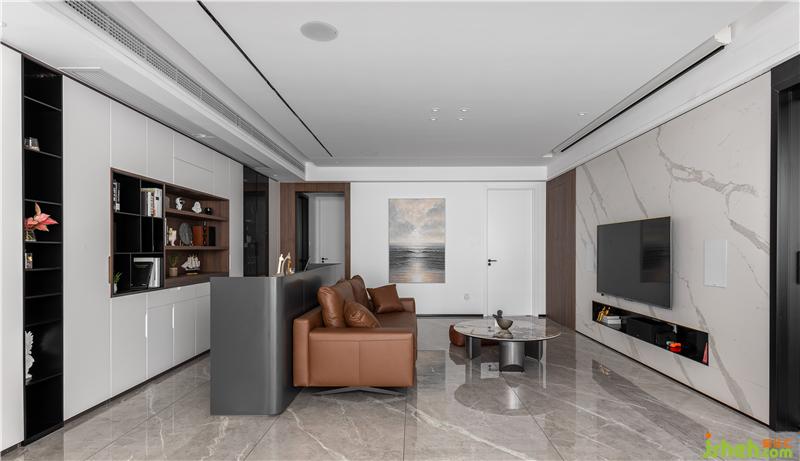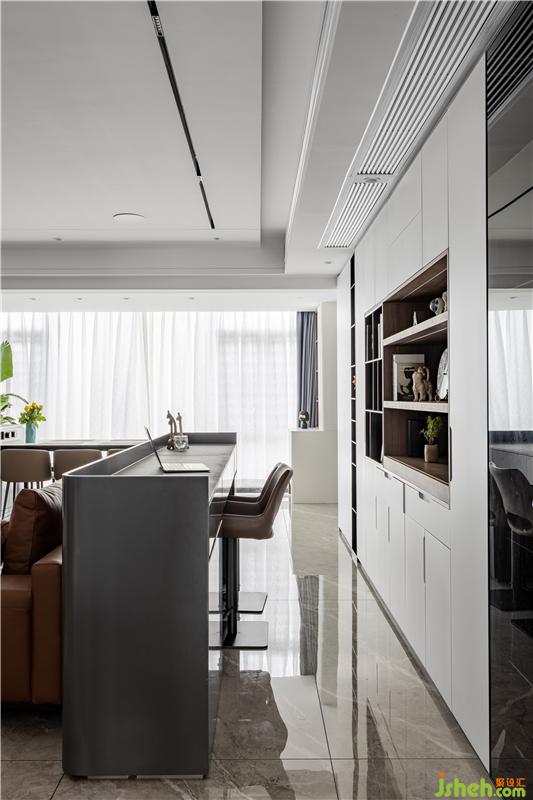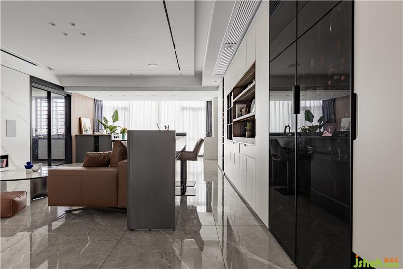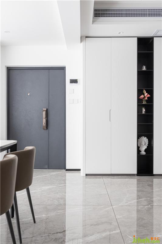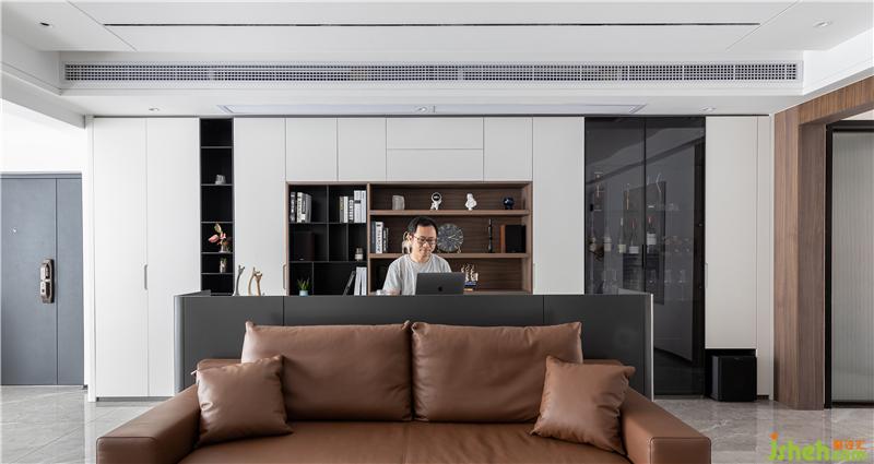 沙發(fā)后面安排了一個(gè)小書(shū)吧,書(shū)吧后面一墻的柜體收納功能只能用“巨大巨實(shí)用”來(lái)形容。它是鞋柜的補(bǔ)充,更是書(shū)柜、同時(shí)也是酒柜,精品柜。藏露有度,黑白分明,讓家更整潔。