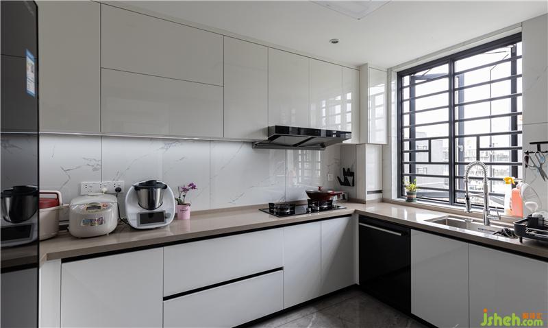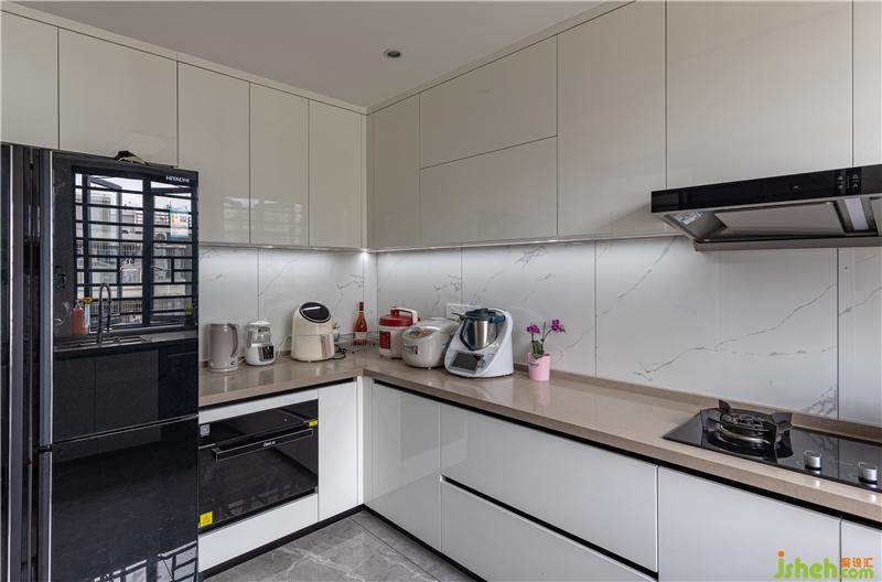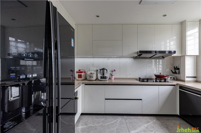 廚房整個(gè)就是一個(gè)“壕”!干凈整潔,所有能嵌入的電器都進(jìn)入它們?cè)撨M(jìn)入的空間內(nèi),小電器也有足夠的臺(tái)面可以安家。