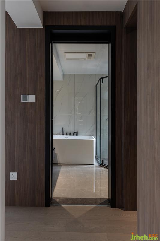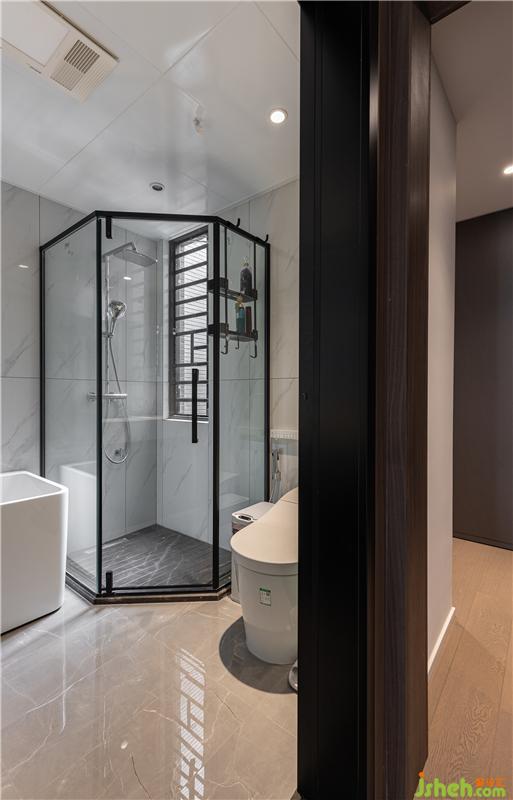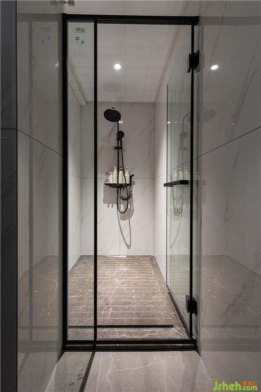 雖然公衛(wèi)的淋浴房非常大了,但主衛(wèi)還是配有鉆石型的淋浴房,方便兩位主人日常使用。吊頂采用大鋁板,更顯大氣整潔。
