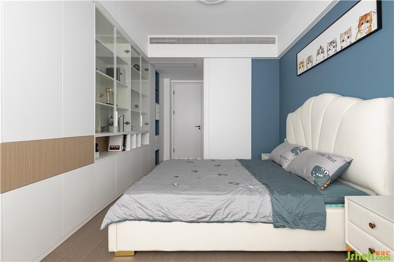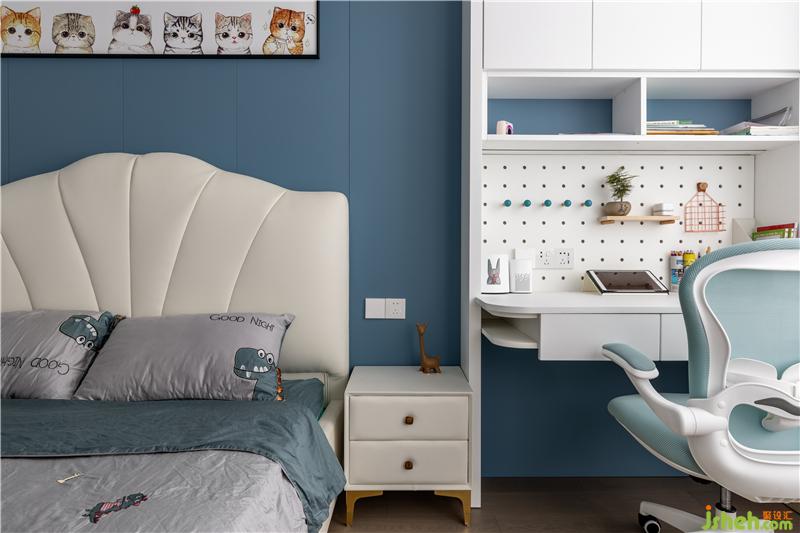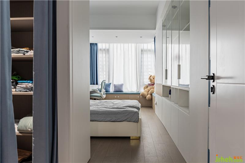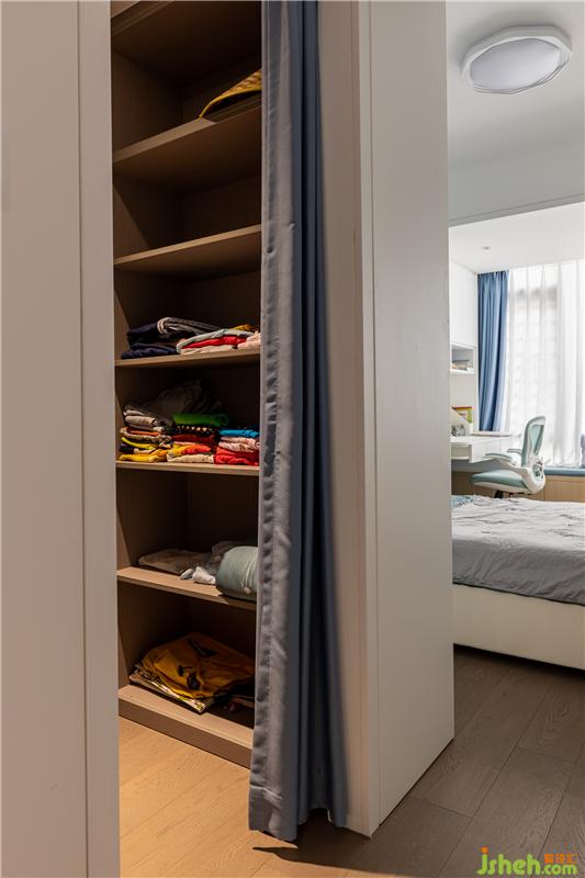 還沒(méi)走進(jìn)姐姐的房間,就感到一陣海邊的清涼,藍(lán)色是姐姐特別喜歡的顏色,低飽和的莫蘭迪色系非常治愈。進(jìn)門左手邊是個(gè)開(kāi)放式衣帽間,這姐姐的房間得有多大廈門家居設(shè)計(jì)!
