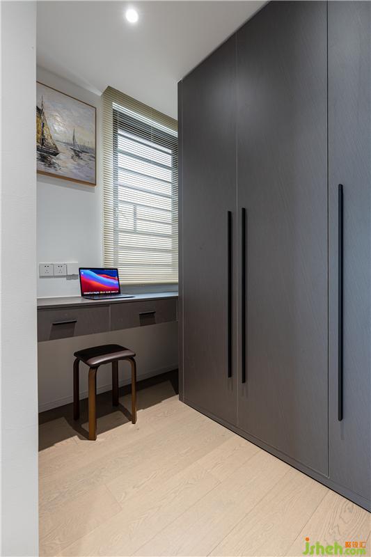 主臥的衣帽間獨(dú)立,利用窗下光線極佳的位置,安排了男主的工作區(qū)。L型的衣柜,收納非常足夠,并在門后設(shè)計(jì)了次凈衣柜,對(duì)于冬天特別友好!