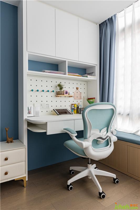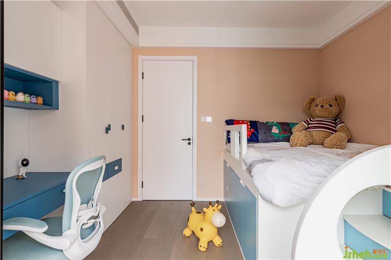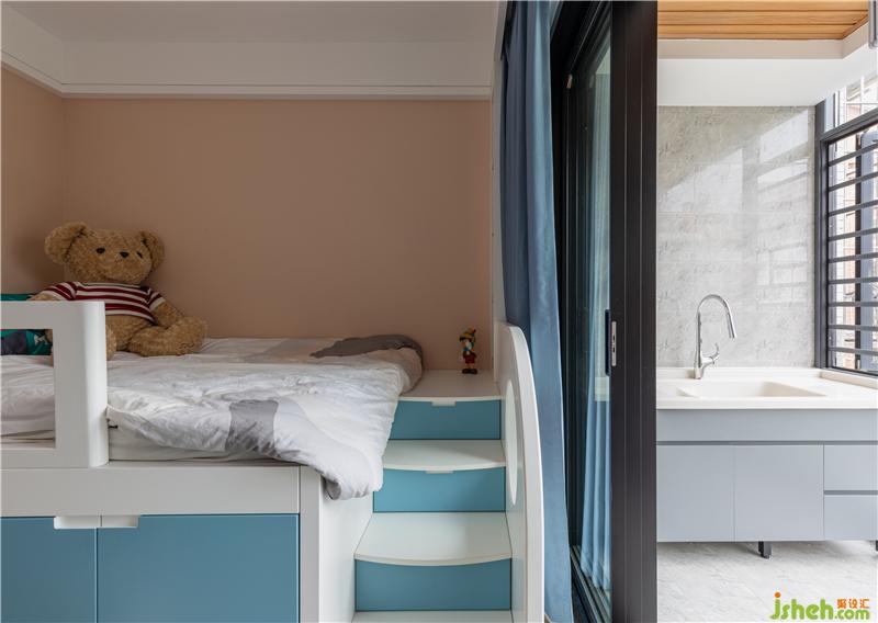 進(jìn)入妹妹的房間,立刻有種粉嫩活潑的感覺(jué)。一組大衣柜藏在門后面,抽屜的藍(lán)色一直延伸至桌面。這個(gè)空間也是藍(lán)色的延續(xù)!