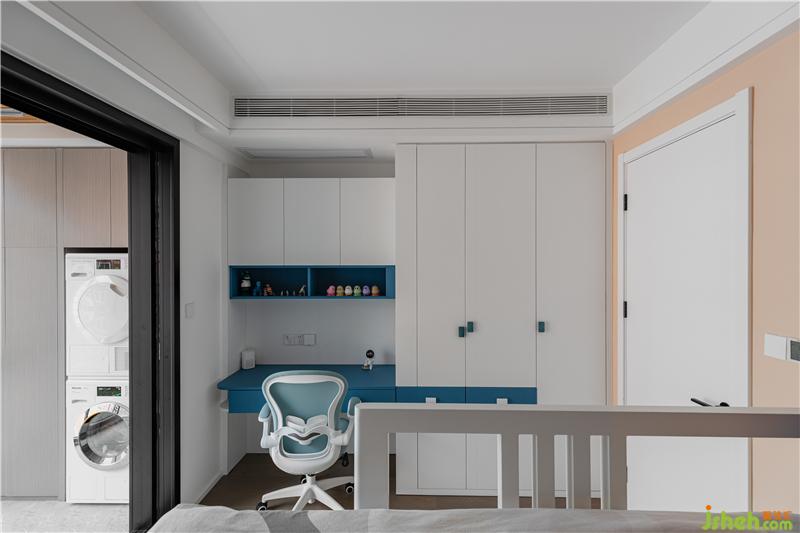 小女兒房的陽(yáng)臺(tái)為生活陽(yáng)臺(tái),行政柜將洗衣機(jī)烘干機(jī)直接包入其中,實(shí)用又美觀,真的沒(méi)有浪費(fèi)一寸