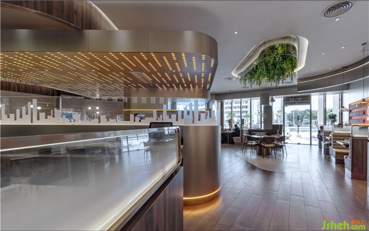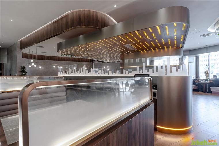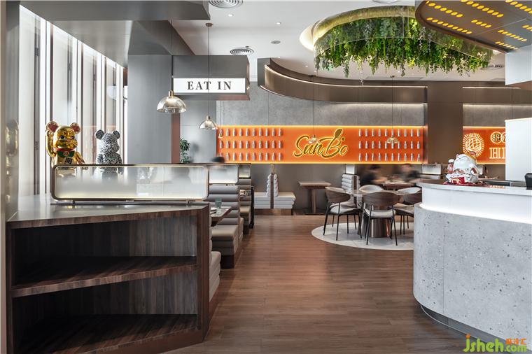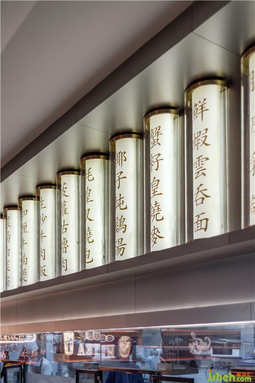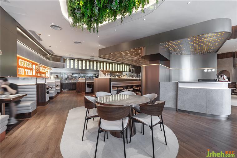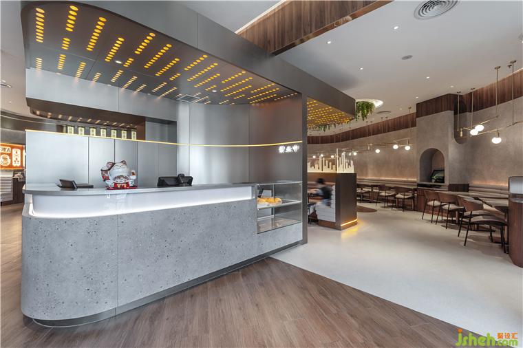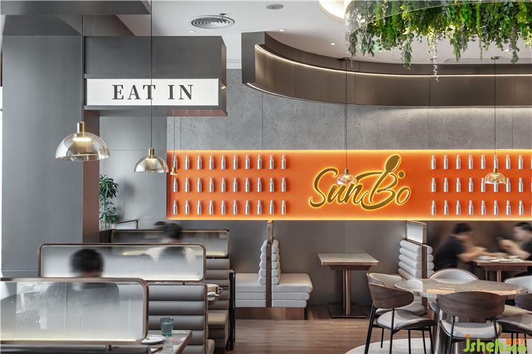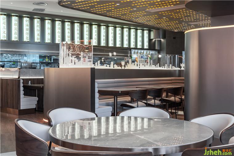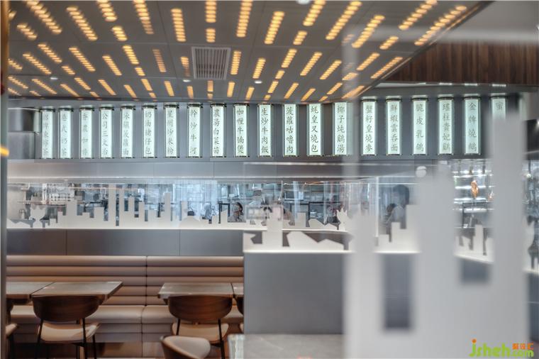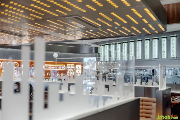 茶餐廳設(shè)計(jì)師將傳統(tǒng)的港式餐廳元素—餐牌與現(xiàn)代科技感結(jié)合,讓其保留特色但更顯高級(jí)。收銀臺(tái)上方的天花吊頂設(shè)計(jì),讓人放眼看去會(huì)有一種時(shí)空穿梭的視覺(jué)效果,搭配上墻壁的燈牌設(shè)計(jì),讓餐廳整體凸顯潮酷與創(chuàng)意性。茶餐廳設(shè)計(jì)卡座椅背的上方用玻璃隔板增加高度,可呈現(xiàn)設(shè)計(jì)感亦可保證就餐的私密空間感。