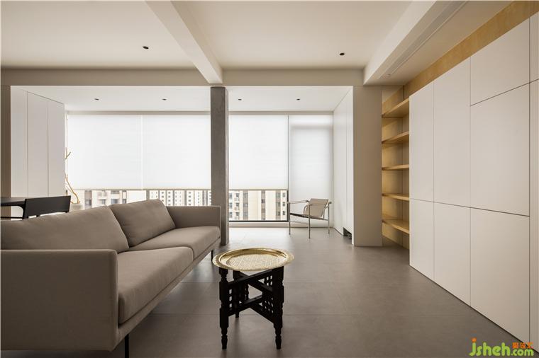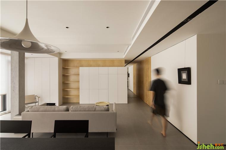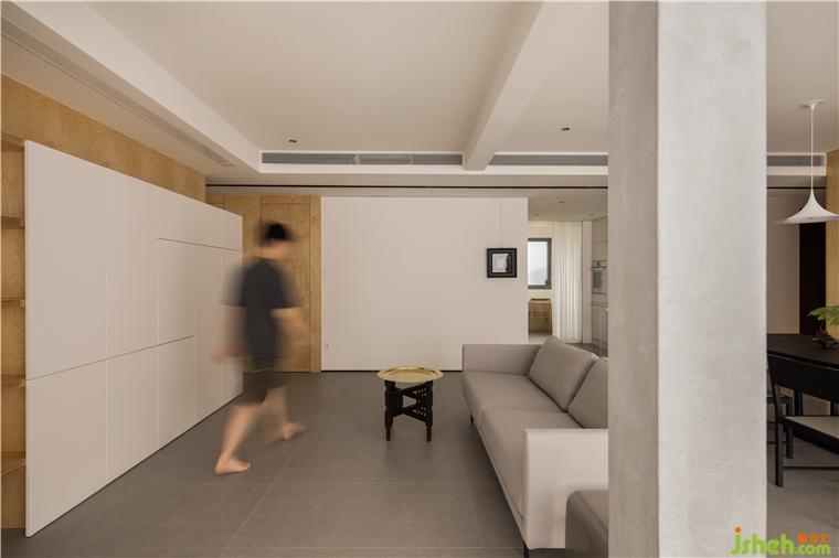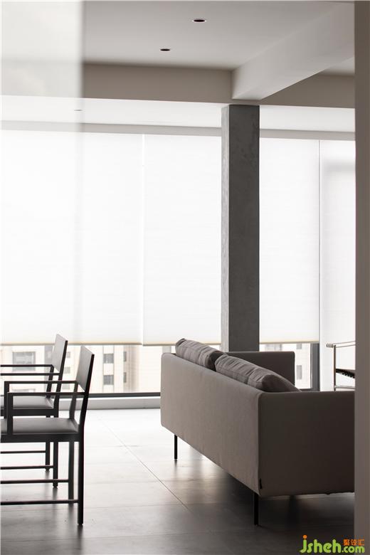 房間的非承重墻體被敲掉后,在公共空間留下了一根布滿細鋼筋的柱子,大平層裝修設(shè)計經(jīng)過粉飾之后意外的有了清水混凝土的效果,伶仃的柱子在這個地帶雖是樸素裸露的樣子,卻成為了室內(nèi)空間建筑感的來源。