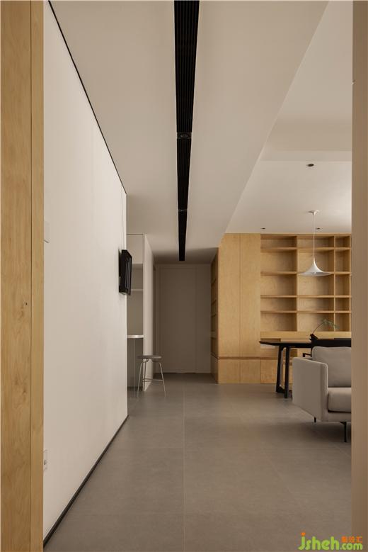 把入戶的玄關(guān)柜和客廳書柜統(tǒng)一起來做,兩個面的轉(zhuǎn)角在空間中產(chǎn)生一種視覺偏差,形成一個獨立個體的樣子。公共區(qū)域的主動線由黑色的空調(diào)風(fēng)口牽引,這條黑線通過路線盡頭鏡面的二次反射,感官體驗被無限的拉長,黑線在頭頂漸行漸隱,空間的末端變得小而朦朧。