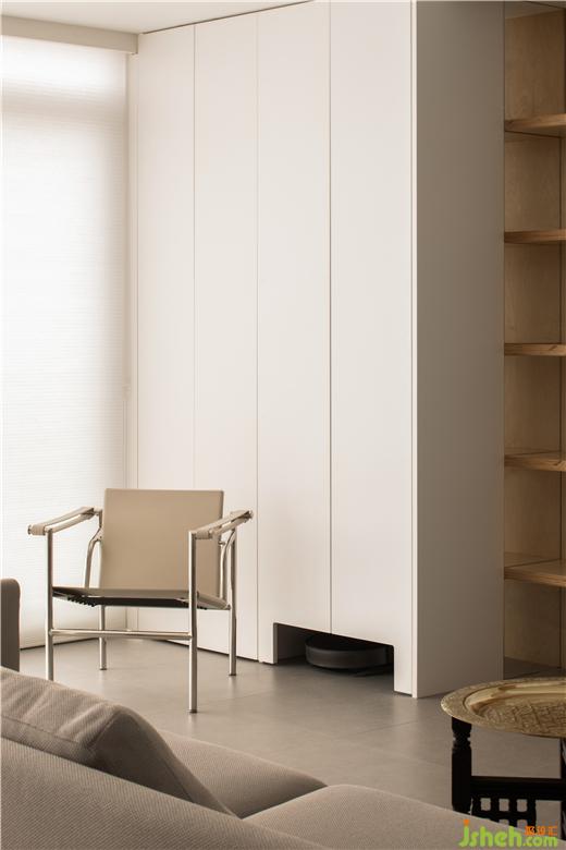 在變大的陽臺做收納,存放家用的一些功能性用具,比如洗衣機、烘干機等,拖地機器人也有專用的“工位”和出入口,這是陽臺的功能之處。但更多的空間是用來作為起居空間的“余?!保齺順O佳的光線,也作為視覺和腳步丈量之用。