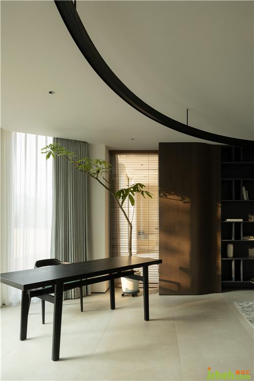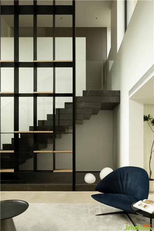 更多的光照了進(jìn)來,層高也變得模糊。倒拱形吊頂下,鏤空的黑色裝飾架縱向延伸,通向一層的樓梯隱藏在其后,作為地下與一層連接通道轉(zhuǎn)化的過渡,是地下會客廳的視覺中心。鏤空的設(shè)計從地面直達(dá)頂面,木制層板橫向錯落,以強(qiáng)烈的比例關(guān)系凸顯大空間尺度,將空間的對外公共性過渡至向內(nèi)的私密性。