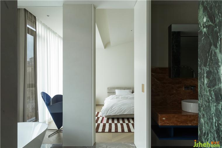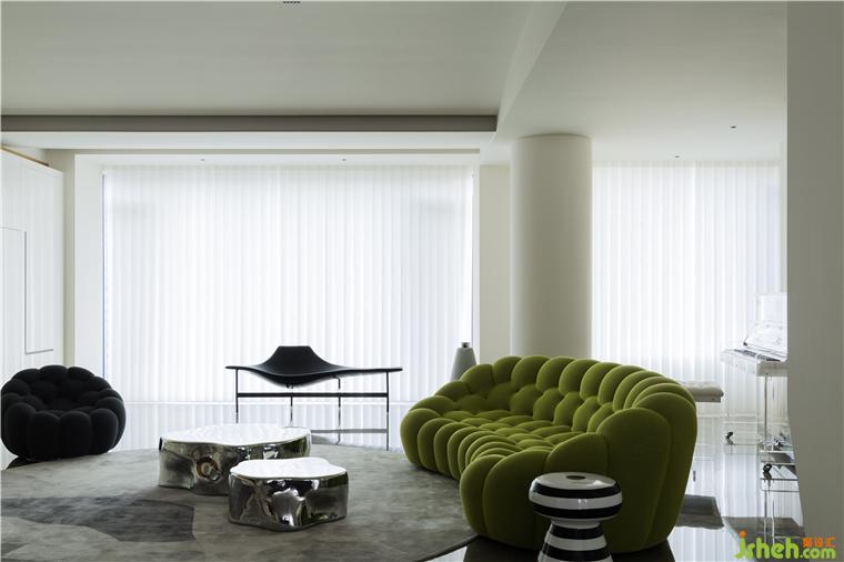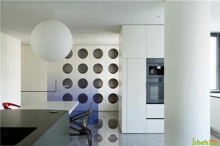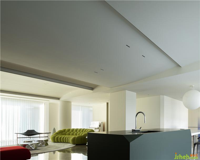 隨處可見的收納系統(tǒng)隨著空間的架構(gòu)延伸,通過比例分割金屬與白色的組合,收納與展示之間相互切換??臻g的家具自由組合流動,無不體現(xiàn)舒適和隨意,秩序感的空間變得可感知。