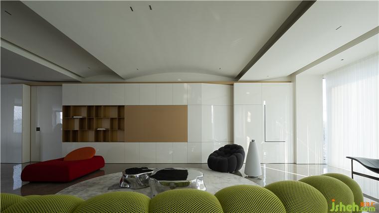 用線條的弧度造出生活的溫度,從現(xiàn)代的穩(wěn)定中跳脫出來,流線型的動感和立體在燈光和金屬層板的映襯下更顯現(xiàn)代浪漫的情調(diào),疊加的曲面將空間柔化并貫穿每一處縱向空間,打破直線的拘謹(jǐn)嚴(yán)肅,賦予空間靈動的多變性。