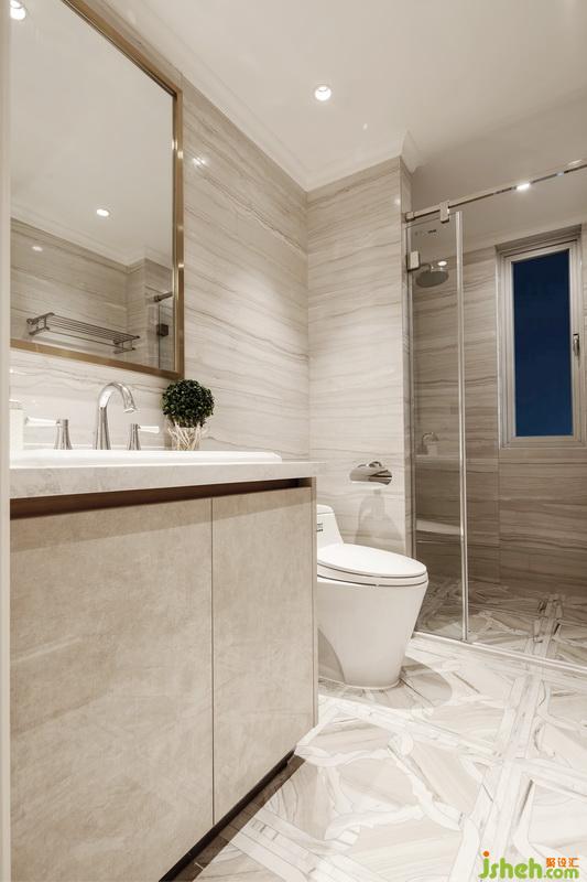 本案衛(wèi)生間比例協(xié)調(diào)、開間大??紤]干濕分離,減少潮濕區(qū)域。適當?shù)牧舭走\用玻璃隔斷讓人在凝聚視覺焦點的同時也大大的彰顯情調(diào)與品味。