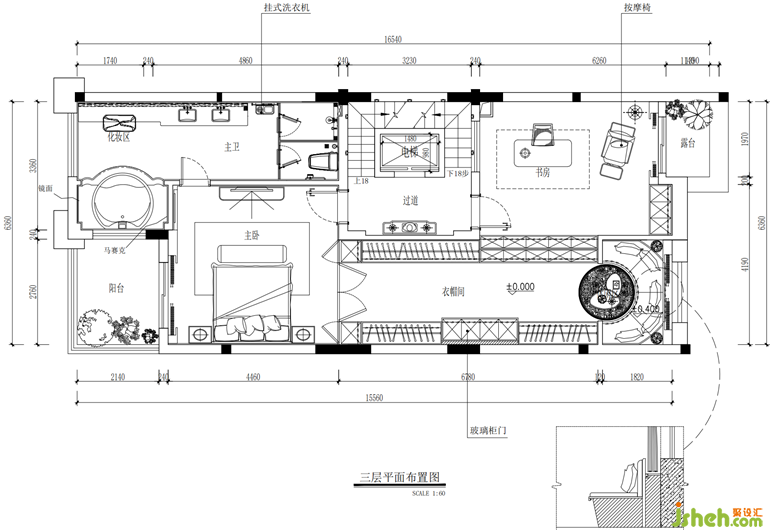 三樓是男女主人的私人空間,套房式的設(shè)計(jì),保證了其私密性,也更大限度的滿足了男女主人各自的愛好習(xí)慣。在交互上,我們也設(shè)計(jì)了靠窗的環(huán)形區(qū)域,背靠美麗的山城,男女主人能在這方獨(dú)屬于自己的天地中互訴衷腸。