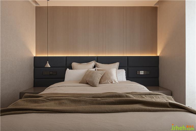 走進(jìn)臥室,原木色的墻面搭配黑色的軟包,筆直的時尚吊燈和墻面讓臥室的精致度得到大幅提升,潔白的窗簾也讓暗色的空間眼前一亮,讓人充分感受現(xiàn)代安靜的生活方式訴求