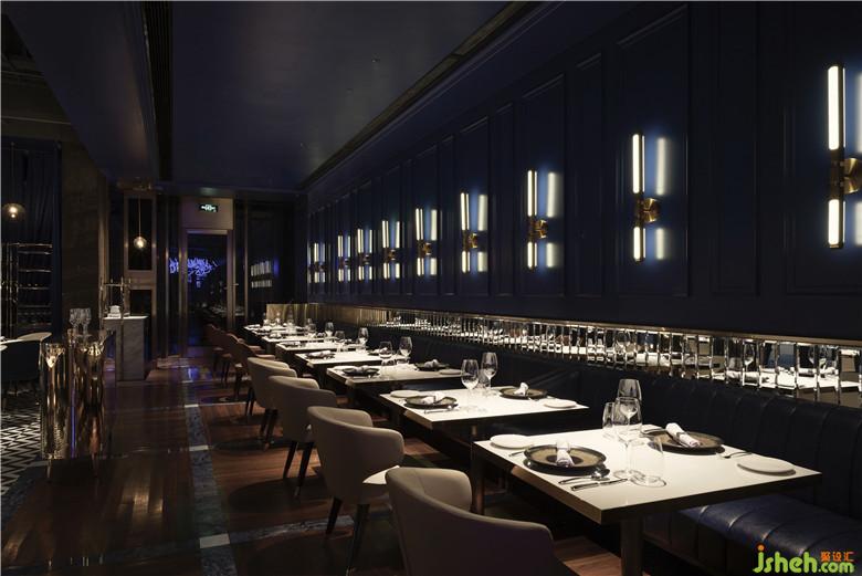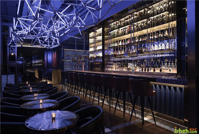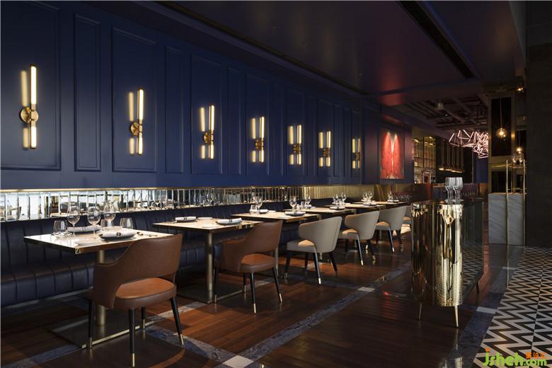 整個建筑呈長條形,近4米高的落地玻璃將黃浦江風(fēng)景一覽無余,根據(jù)建筑形態(tài)把就餐區(qū)依條形布置,將廚房靠后,以此呈現(xiàn)出酒廊的基本空間形態(tài)。室內(nèi)設(shè)計師將300m2的酒廊劃分為餐區(qū)、酒吧、廊吧、廚房四大區(qū)域,以藍(lán)色為主基調(diào)將幾個區(qū)域連成一體。