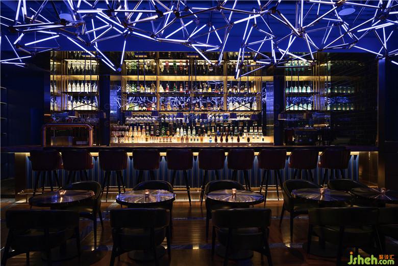8米長的吧臺占據(jù)了整個酒吧的主導(dǎo)位置,室內(nèi)設(shè)計師利用大面積的鏡面將原本不大的空間在三維中延伸,映襯著對岸的風(fēng)景,專門定制的主花燈以老船廠的結(jié)構(gòu)支撐形式為出發(fā),重復(fù)、疊加,用數(shù)控將音樂與燈光統(tǒng)一聯(lián)動,使整個空間呈現(xiàn)出夢幻般的律動。