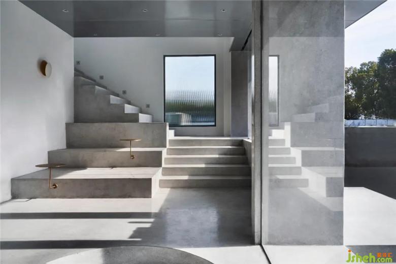階梯作為連接三層空間的主要路徑,承擔(dān)著三維坐標(biāo)軸的角色。長(zhǎng)方體塊的直向運(yùn)動(dòng)呈現(xiàn)階梯的連續(xù)狀態(tài),在這個(gè)縱向的空間里,裝修公司設(shè)計(jì)了一個(gè)鏡頭狀的圓形窗,使這個(gè)縱向路徑有了橫向的視線,同時(shí)鏡頭的形式給窗戶的功能帶來窺視感,形成趣味性的第二空間體驗(yàn)。
