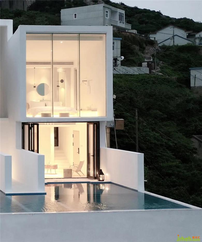 作為對海平面的回應(yīng),將原有建筑所在的東南方位向西南整體旋轉(zhuǎn)90o,以獲得最佳的景觀面。酒店設(shè)計在20m×6m的建筑紅線區(qū)域內(nèi),由三條1.2m寬的通道切割出4個獨立建筑體。高聳的通道作為進入建筑內(nèi)部的路徑,將視線引至海平面,給原有的場所增加一份精神感知。建筑前方的泳池設(shè)計,既作為海面向內(nèi)的延伸,也給單一的住宿功能增添一份特殊性與趣味性。